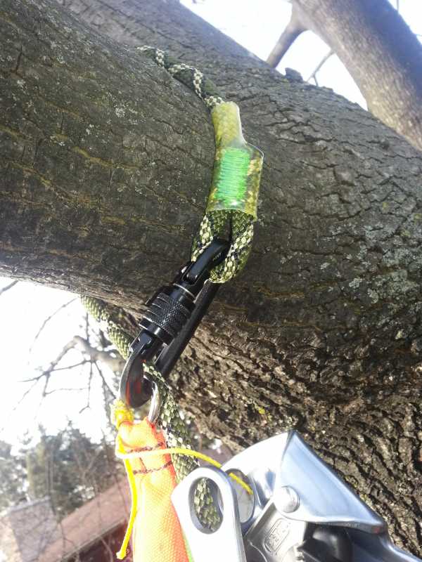 Position your pull down line behind the splice instead of inside the carabiner. That way when you pull down you get rid of a tight bend in the line. It makes the screw link run down the rope much better as you pull down. Try it on a low branch-tying the pull down line behind the splice, and see the difference. Yippee! We all love to run freely.